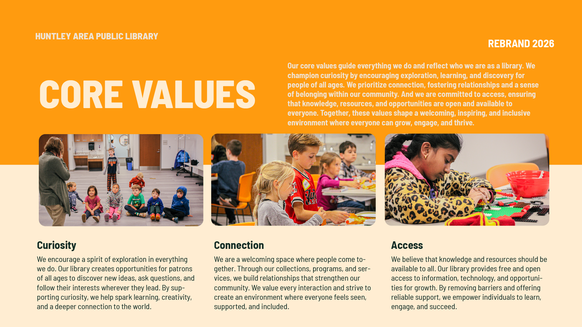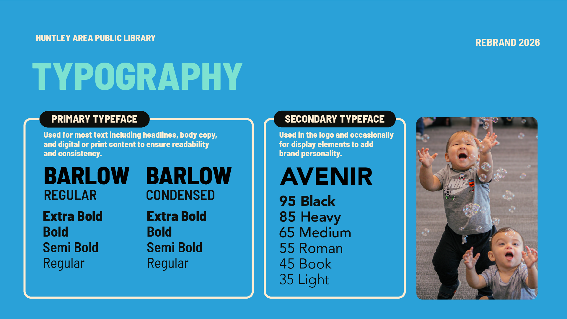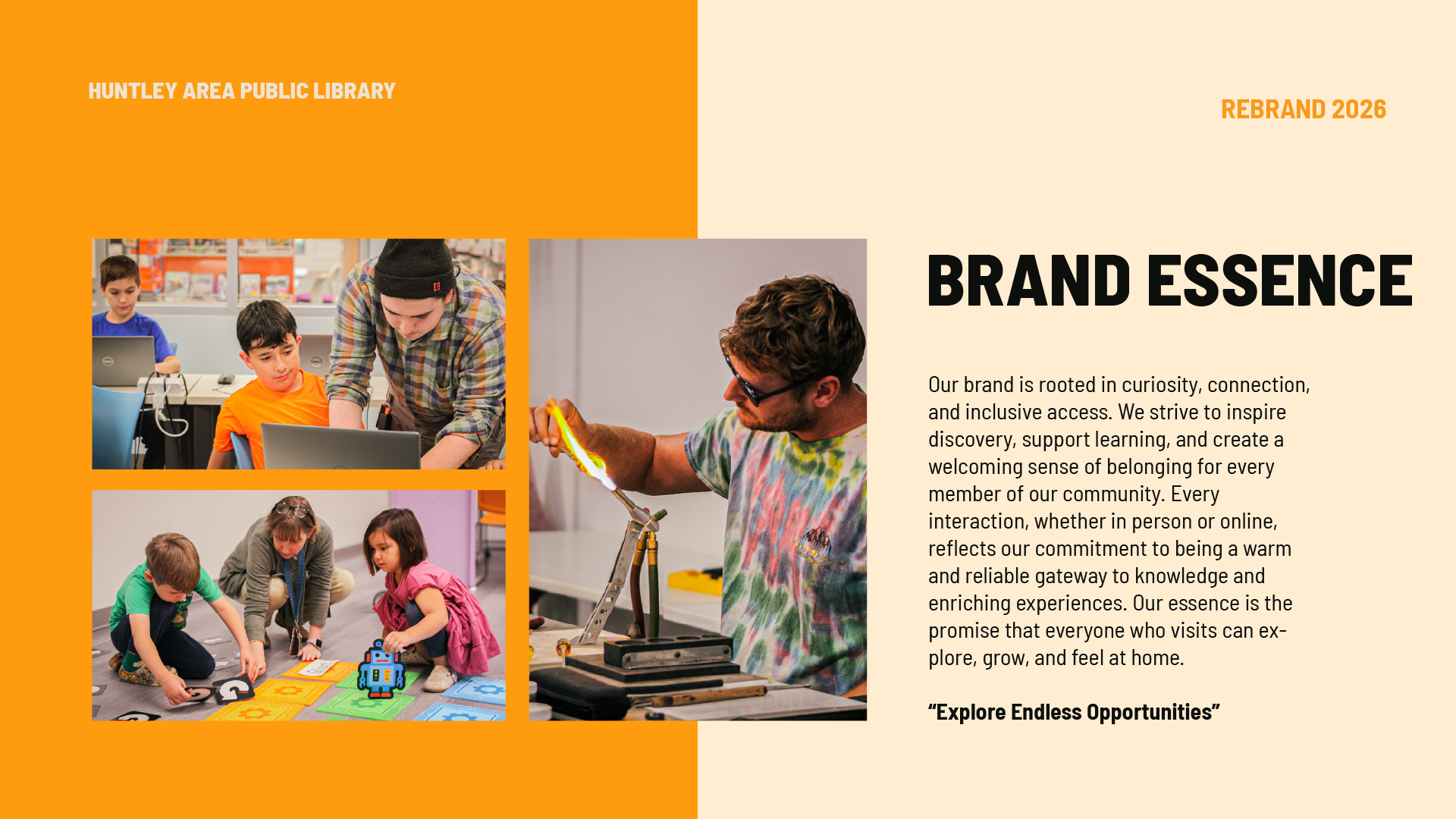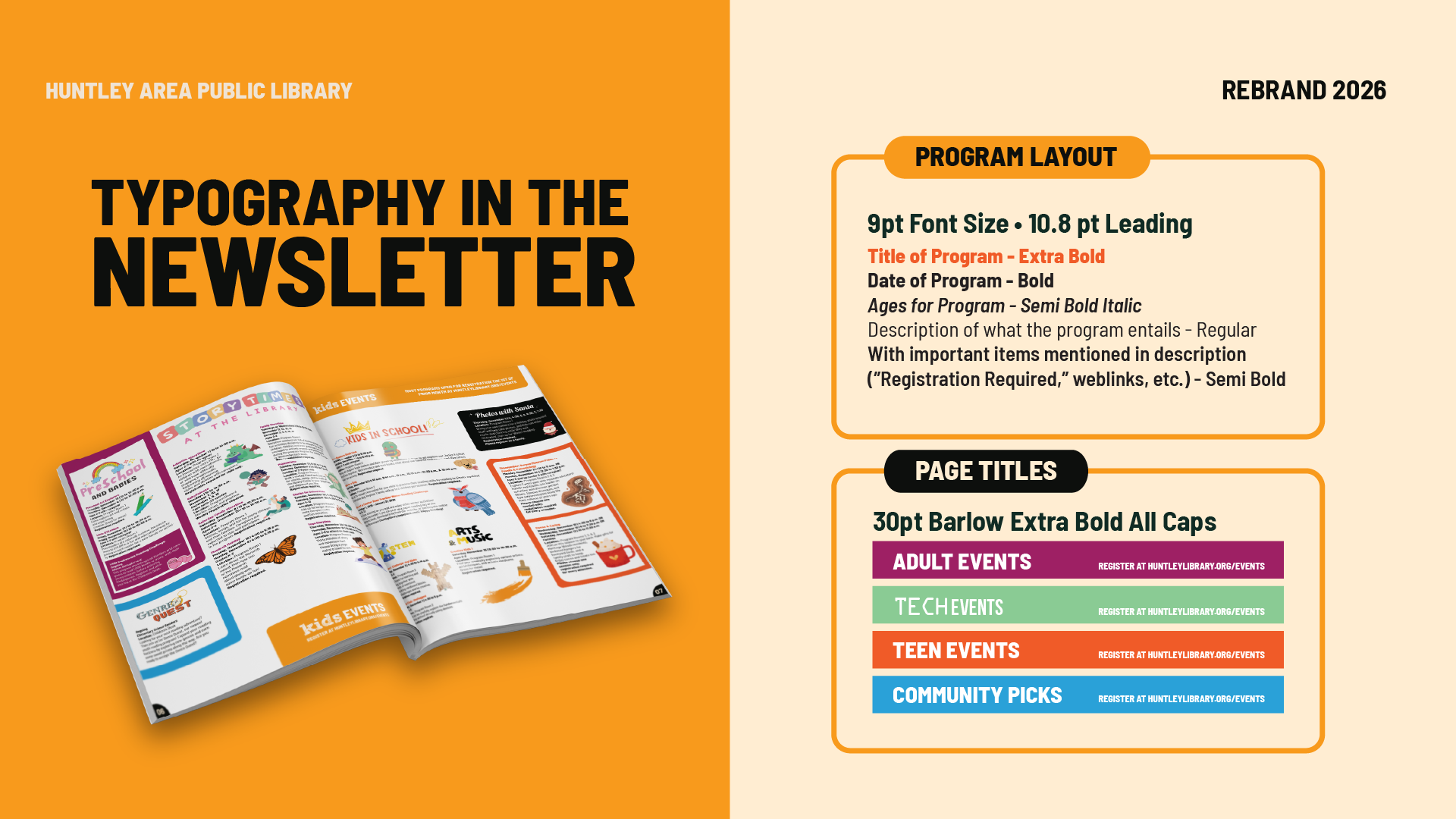 Led a full brand refresh for Huntley Area Public Library, updating colors, logos, and brand guidelines to unify the library’s visual identity. Created a cohesive system that allowed staff to produce signage, ads, and materials consistently, overcoming the limitations of the previous muted palette and scattered approach.